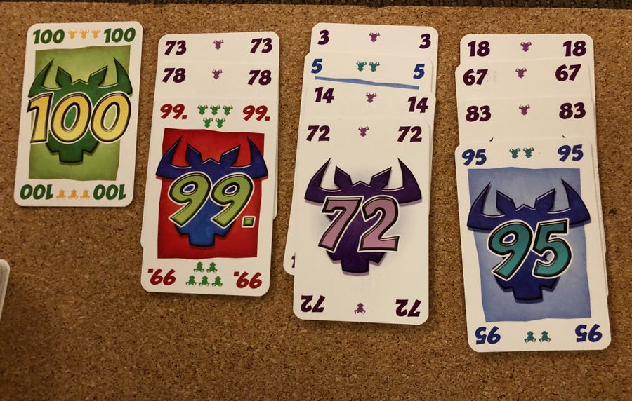 Ich hasse Stichspiele und simple Kartenspiele, dass ich vom Tisch aufstehe, lieber das Kochen übernehme oder irgendeine Hausarbeit als mir das anzutun. "6 nimmt" gehört auch gar nicht in diese Kategorie, sondern ist ein strategisches Kartenspiel mit genau 104 Karten, die so lange reihum aufsteigend ausgelegt werden bis eine der vier Kartenreihen 6 Karten hat, derjenige bekommt die Karten, die ihm dann entsprechend er abgebildeten Hornochsen Minuspunkte bringen. Das ist alles und das macht so unglaublich viel Spaß, dass ich sage und schreibe 42 Partien gespielt habe im letzten Jahr, alle online bei Board Game Arena bis ich mir gestern für sechs Euronen das Ding für die Gruppe bestellt habe und das im nächsten Jahr mal etwas pushen werde, super Rausschmeisser, Reinkommer, Zeitüberbrücker, das Ding hat zumindest bei mir Suchtpotential.